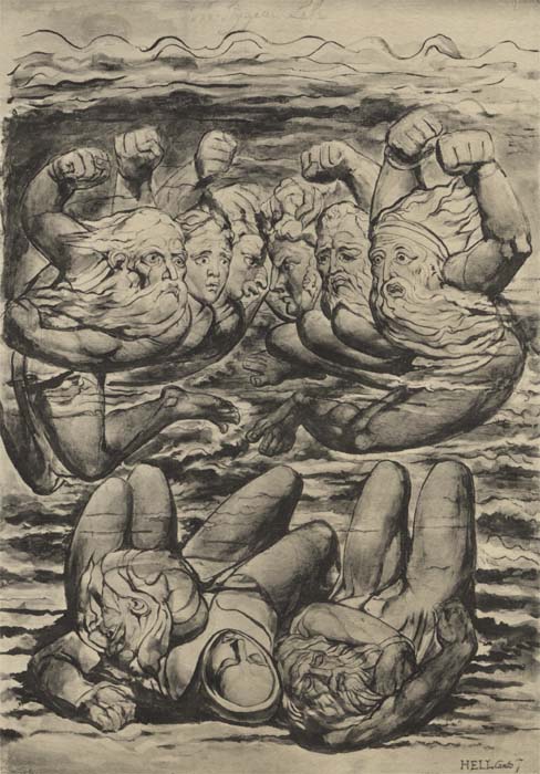 You can see them on the cover of your bulletin, which is, yes, actually art by William Blake. On the top are those caught up in wrath and on the bottom those caught in sullenness.