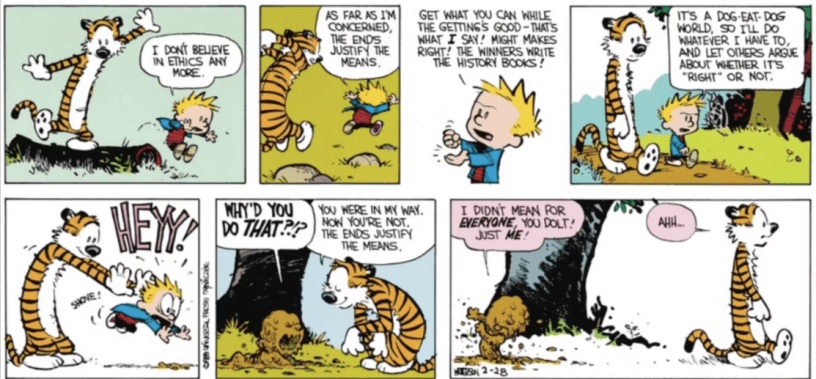 “You were in my way,” Hobbes replies, “Now you’re not. The ends justify the means.”